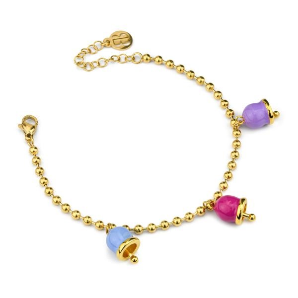 CL/BR13 Bracciale placcato oro giallo con tre campanelle indaco, fucsia e viola